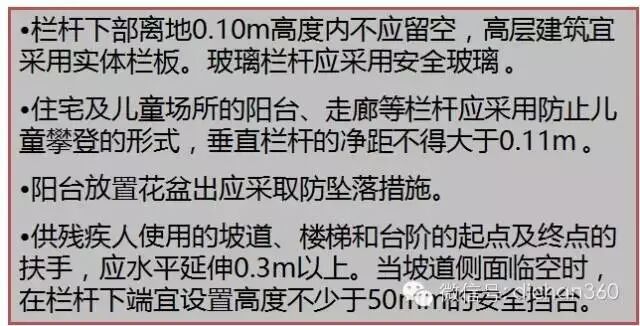 ❷间作安全防护栏杆时,其高度从露面算起应不低于1.05m(多层)和1.10m(高层)